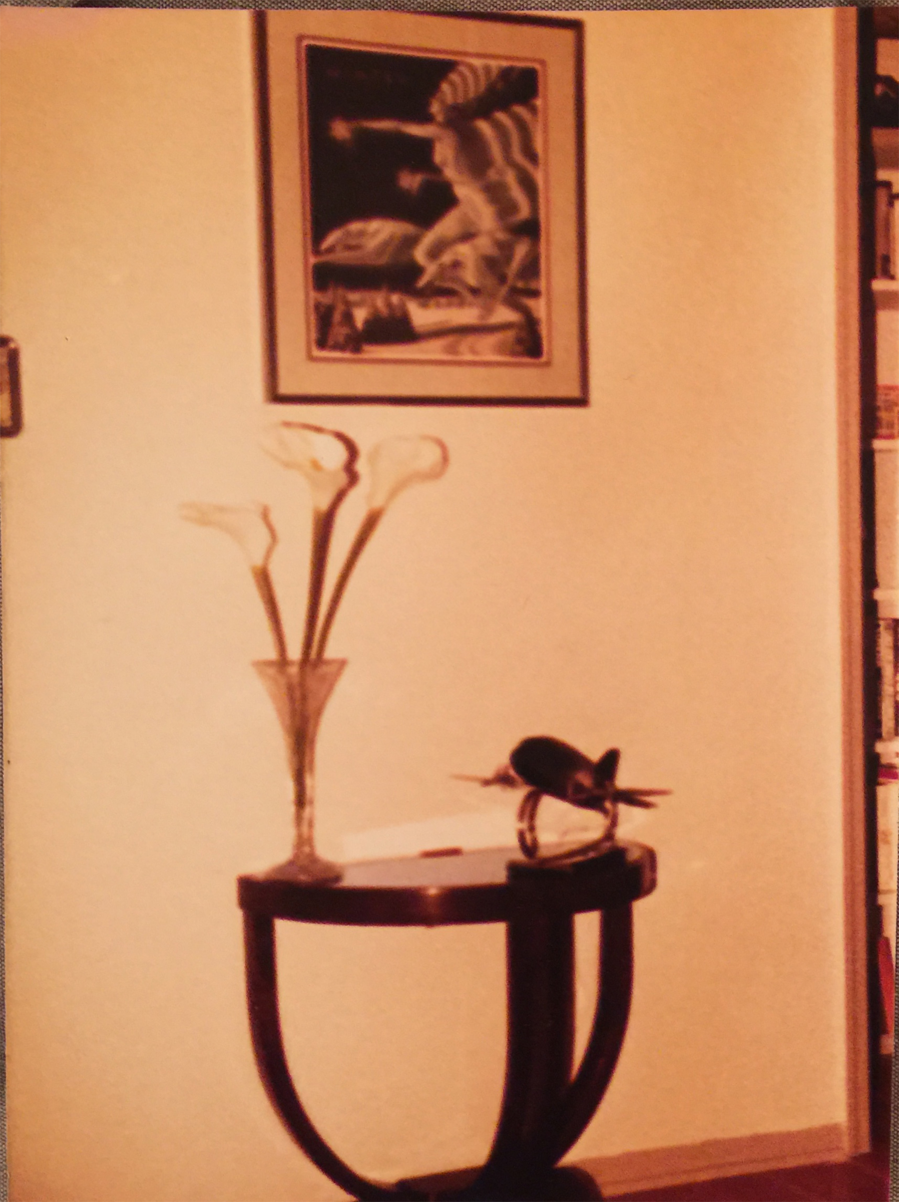 Not too far from where I lived I would go to Trash or Treasure, an antique store loaded with stuff and not neatly displayed. One needed to hunt around to find the treasure, but it was there, hiding. And one day in May of 1982, my mom noticed a pair of half circle, blue mirror end tables. Many years later I noticed December 21, 1939 stamped on the bottom. Blue glass tables would be popular for all of the 1940’s. They are considered Deco, even though that era came to an end by 1941. This would be the start of my Art Deco collection. $75.00 ($190.00 in 2017 money) was the price for the tables. They were in pretty good shape, but not perfect. But my mom saw this as a way out of the Coca-Cola museum and the now very dated Bi-centennial decor. She suggested I could turn the room into a little living room where I could entertain friends and watch old movies. The idea appealed to me, so we purchased the tables and in came the Deco and out went the Coke.