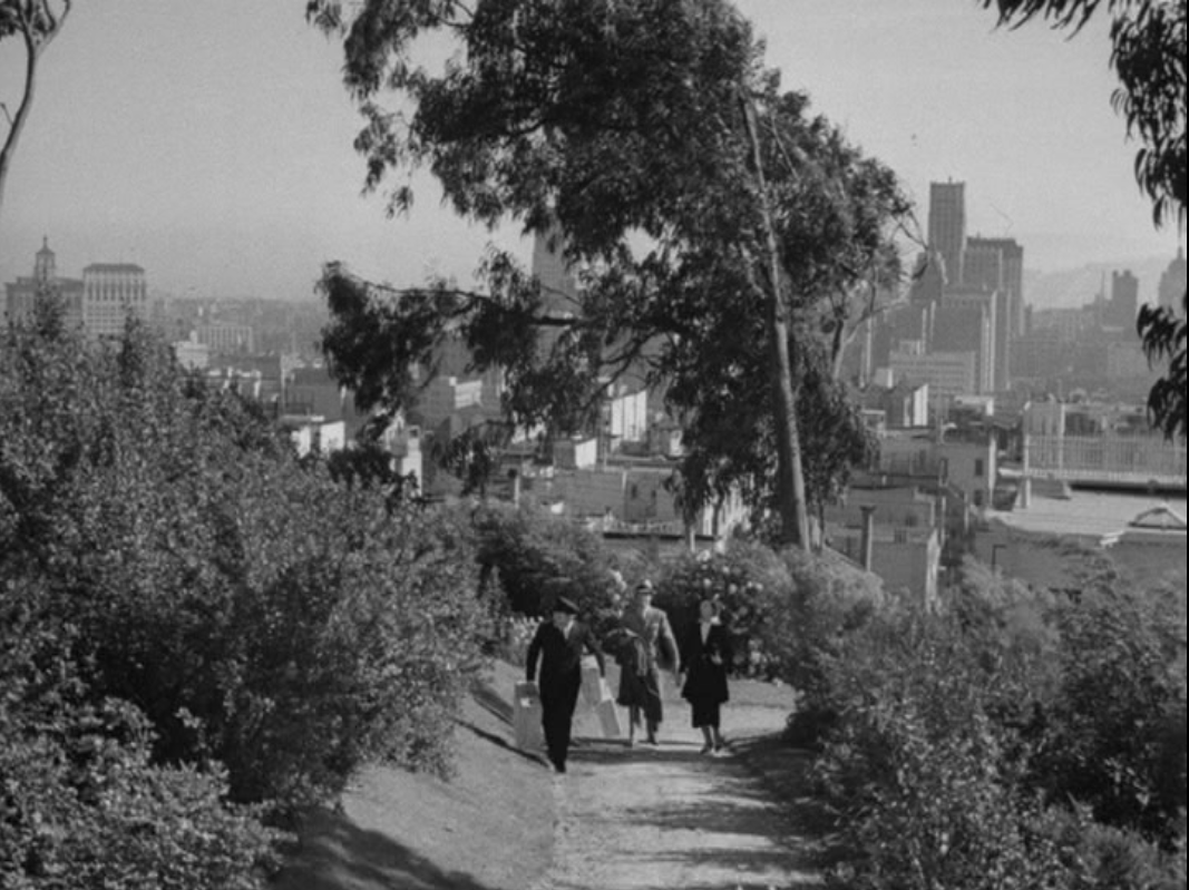 Establishing the location with the arrival of the train and actual shots of Nick and Nora in their Packard Super 8 arriving to a spectacular home in the Telegraph Hill district of San Francisco.