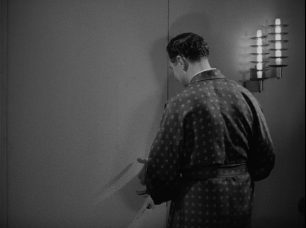 Nick puts Asta out for the night. Another round mirror and some nice metal deers on the dresser framing the radio. Image from Warner Bros. DVD.