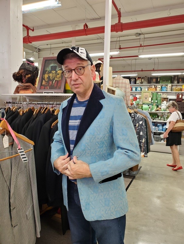 This is a large mall with lots to see. Toward the back corner, a vendor specializes in kitch household goods. Before we explored, Anthony tried on some cool threads to get into the proper mood. Can you dig it?