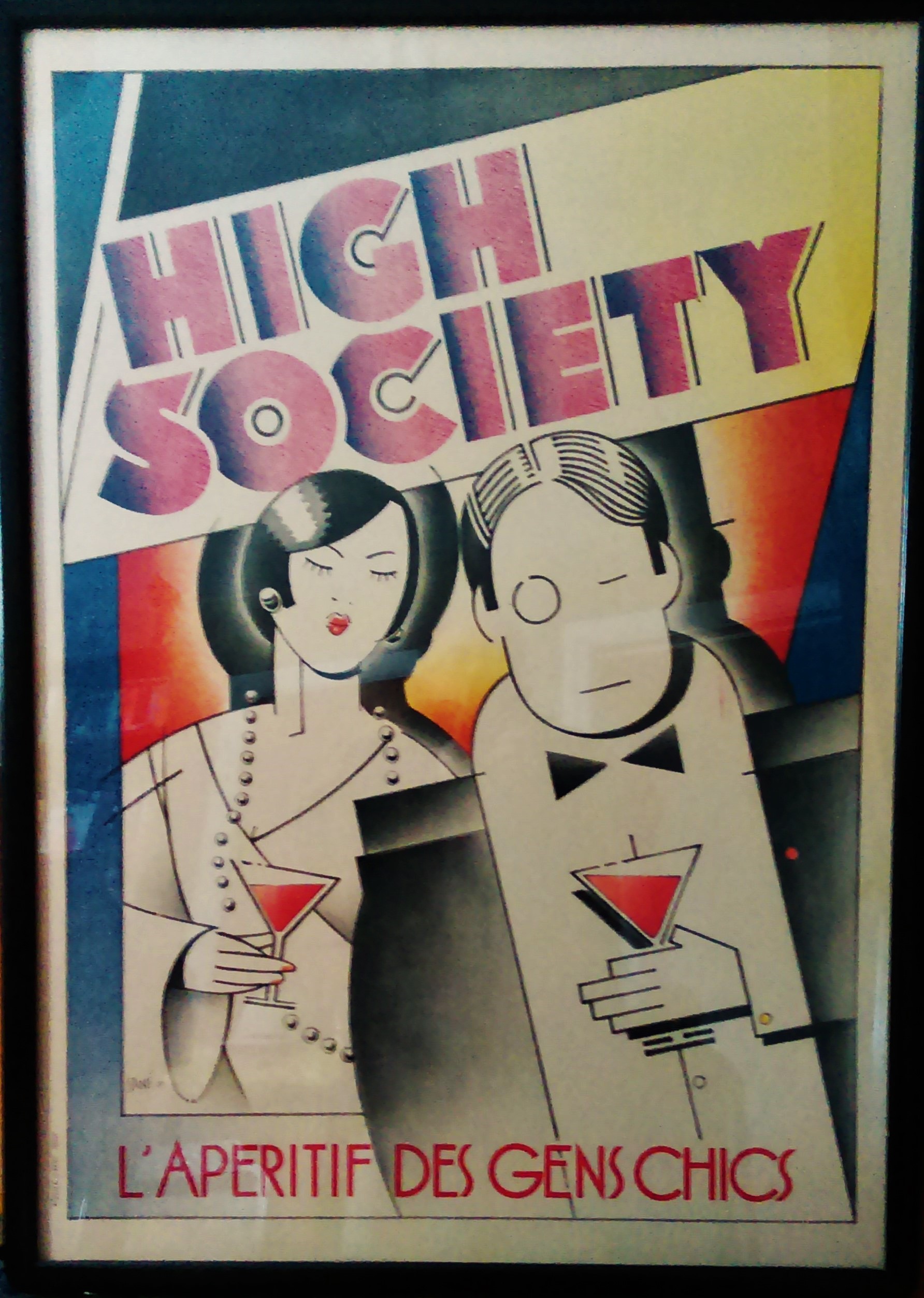 Purchased at a second hand / antique store, Treasures From The Attic  in Southampton, NJ, for $95.00. High Society has a clouded history. Although signed Sané 28 in the border, there is no evidence of it designed or produced in that year. It’s actual production date is circa mid 1950’s. A popular and stylish image, 1980 reproductions are printed on high gloss paper with the outside border removed. Or, reproduced with the border but with the signature removed. I thought my poster was an earlier, more valuable, version and was thrilled to have the expert agree. She estimated the value at $600.00-$700.00. It garnered a lot of attention and admiration from other attendees.