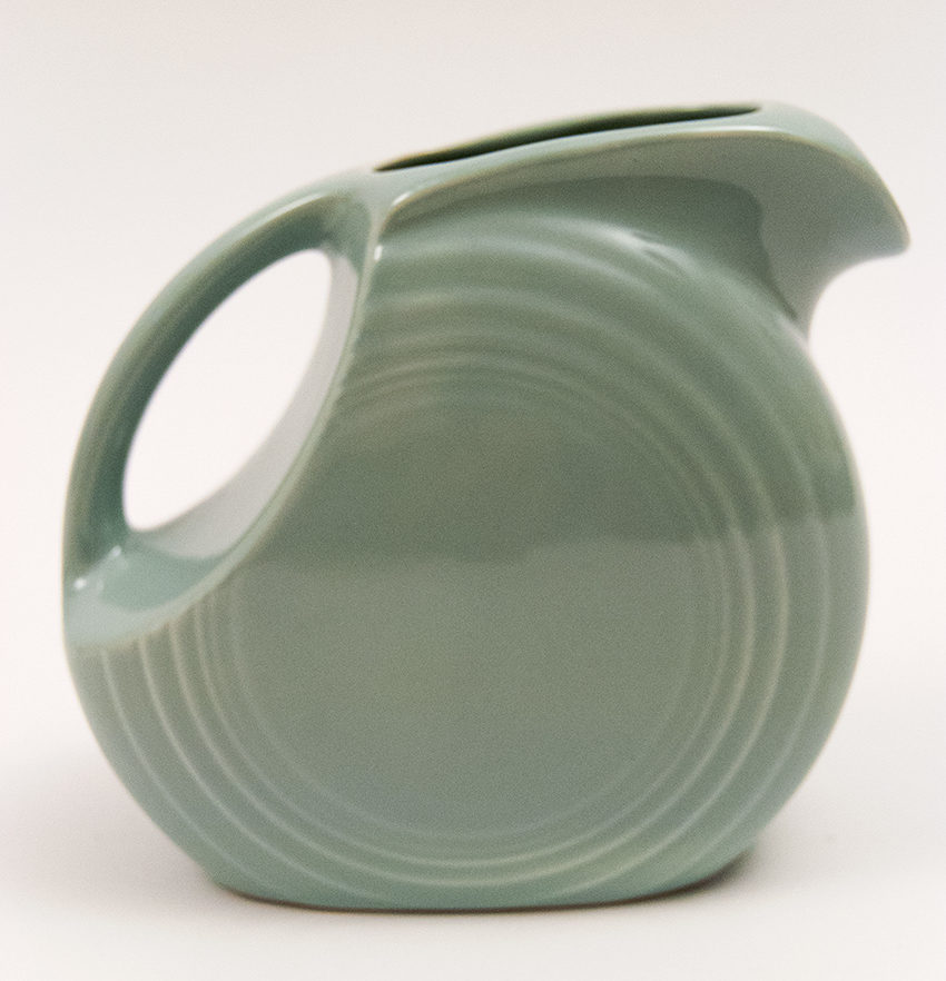If you follow us regularly you know that Anthony has an extensive collection of vintage Fiesta. In 1948, Homer Laughlin’s Pottery Company produced a juice pitcher in celadon green as part of a promotional set to introduce their new Jubilee line. Extremely rare, we have seen this only twice. The first time was at Heart of Ohio Antique Mall in near mint condition and Anthony passed because of the asking price. The second – can’t remember where – but Chris remembers that we passed on it because of a condition issue (hairline crack).