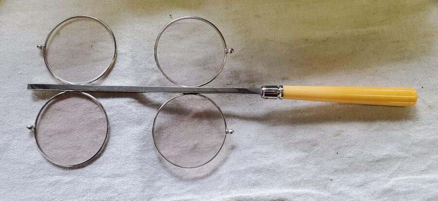 So, did you figure out the mystery item? It’s a Pince-nez sizer. It is used to measure the width of the bridge of the nose to assure your armless glasses stayed put! I think!