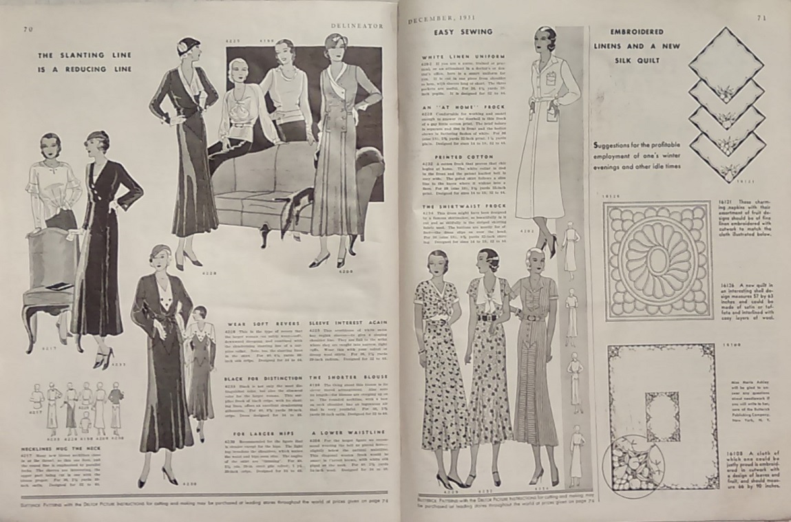 Should you decide to collect a few (they look great framed), you may note that the sizes are somewhat at odds with preset-day patterns. They can be sized by age (because every female is the same size at the same age) or by “then” sizes. For example, size 14 then would be a 32″ bust with 35″ hips while today size 14 is 36″ bust and 38″ hips. It may not seem a lot but any woman knows what a difference of a few inches can make in fit and comfort. (Get your minds out of the gutter.)