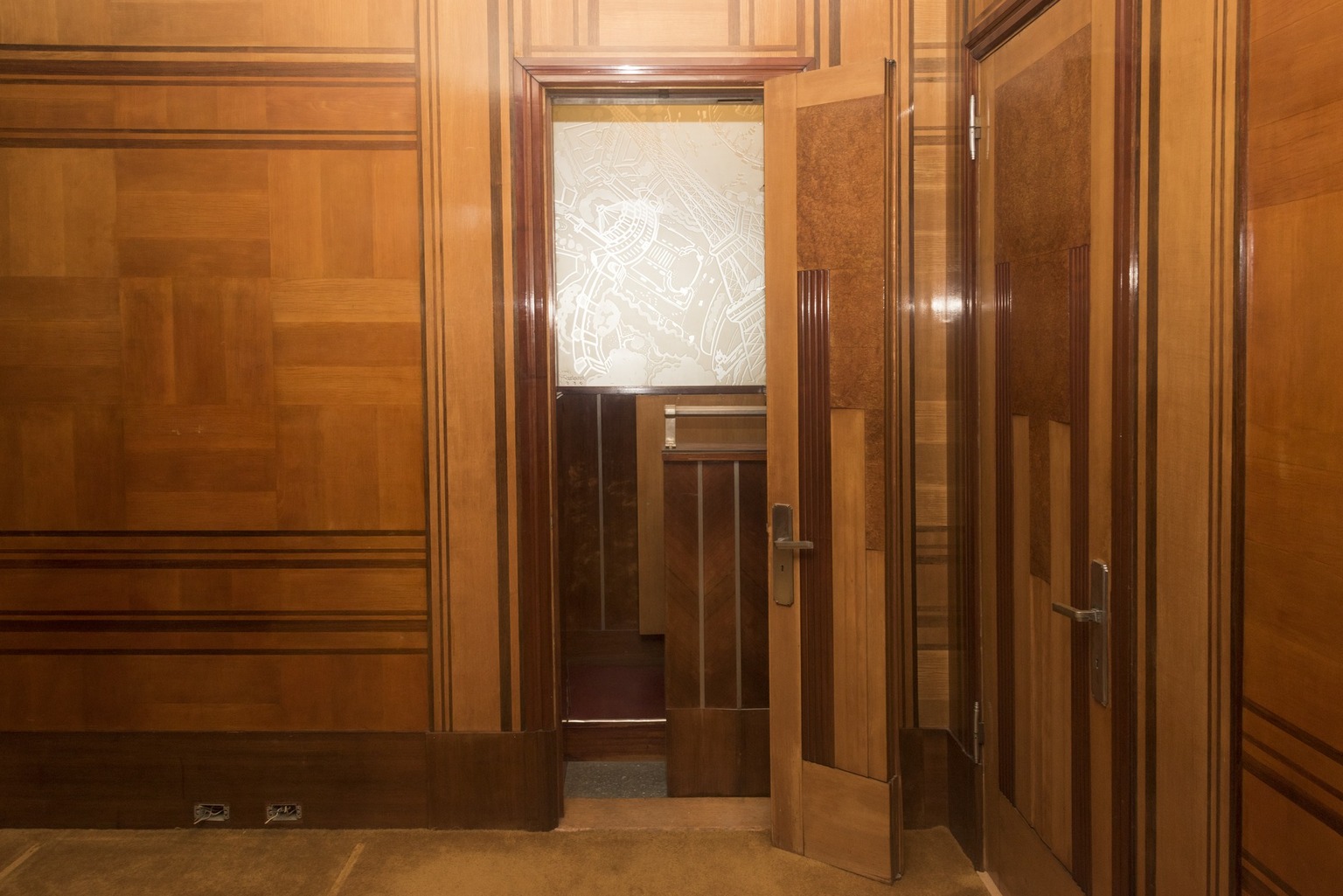 Designed by the New York office of the Parisian decorating firm Alavoine, this elegant study, made for an elite client, was a conservative interpretation of the Art Deco style; this can be seen in the geometric paneling of palisander and olive wood veneers and the large abstract lacquer panel, designed by Henri Redard and executed by Jean Dunand. A small, concealed bar, with etched glass walls that salute France, is hidden in the corner in defiance of Prohibition, which forbade alcohol consumption in the United States from 1919 to 1933. Interestingly, while this room was furnished in the Art Deco style, the public rooms in the rest of the Worgelt apartment were furnished in a more conservative French eighteenth-century-revival style.