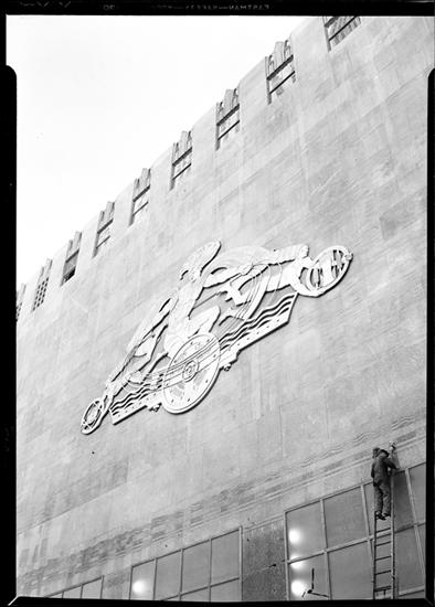 Leather covered orchestra door showing Hildreth Meière silhouettes above. Irving Browning photo, 1932. Image from Getty Images/New York Historical Society.