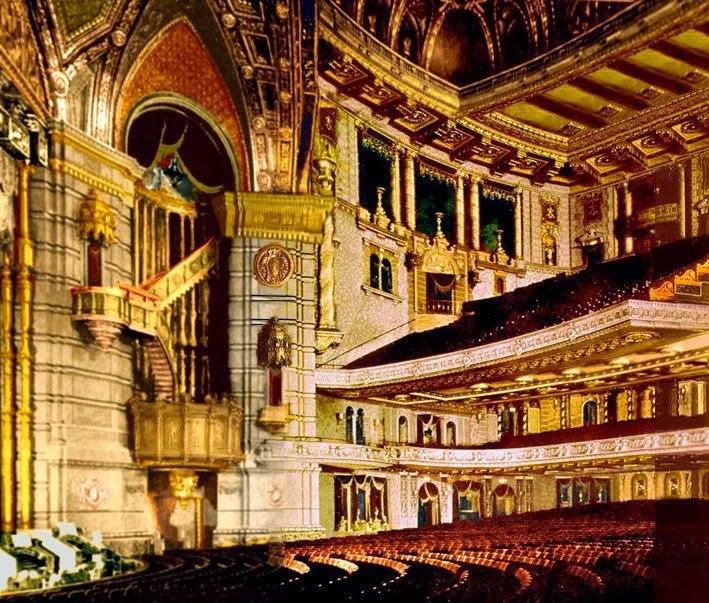 Stage curtain, organ grills (built into the mahogany walls) ornamental ceiling and the chandelier. Samuel H. Gottshco photo, November, 1932. MCNY.org