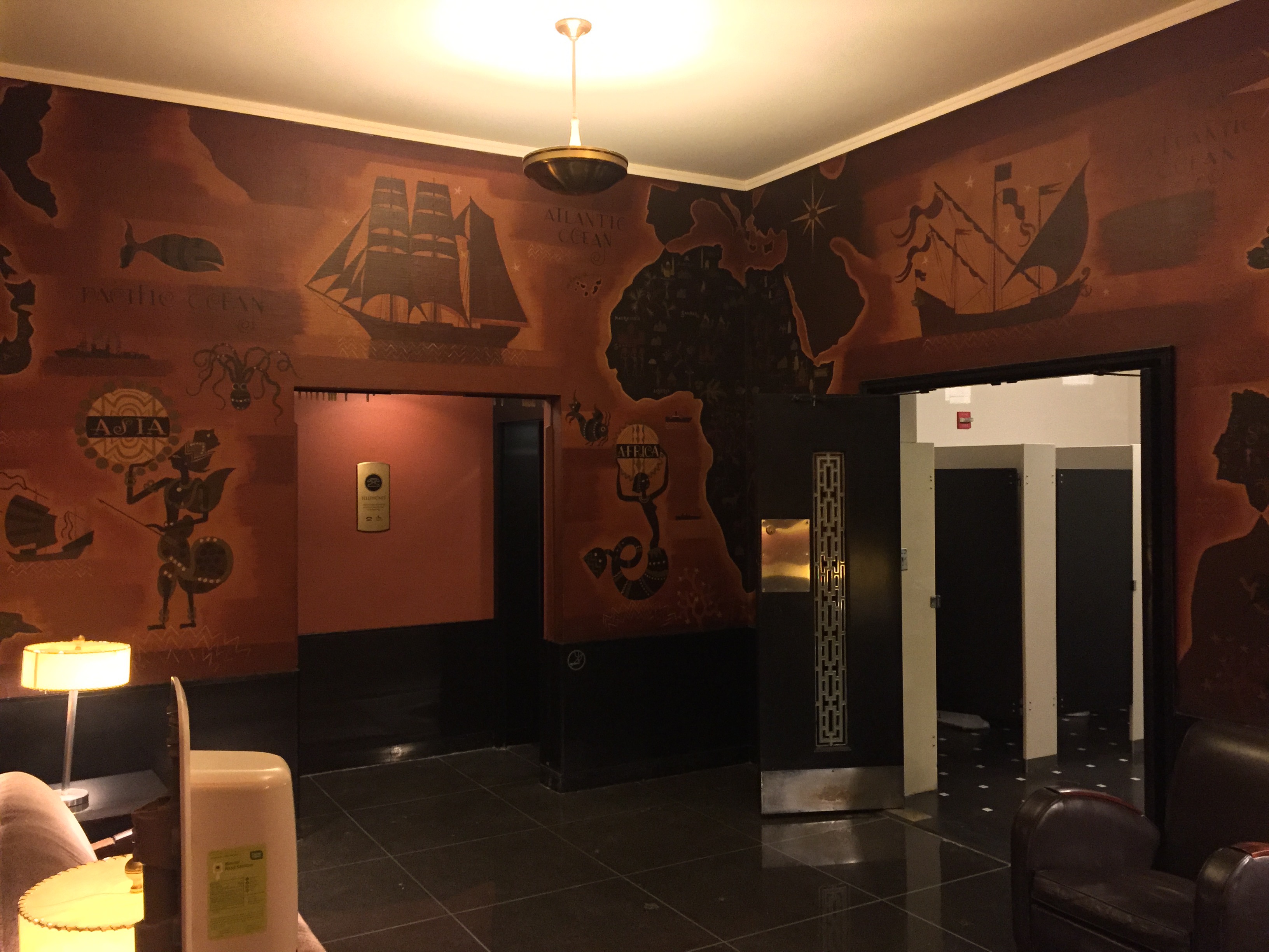 The walls of the first mezzanine men’s smoking room are covered in a canvas mural. Designed by Witold Gordon it depicts in a stylized, modernistic version of Maps of the World.