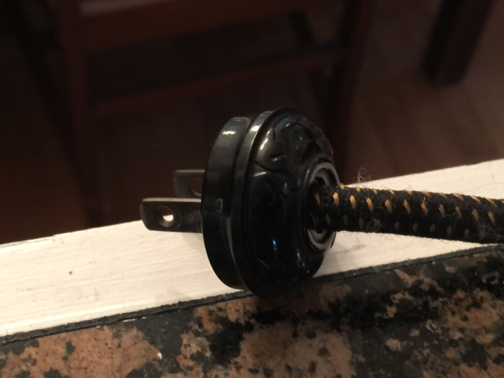 - Close up of the plug and cloth electrical cord.