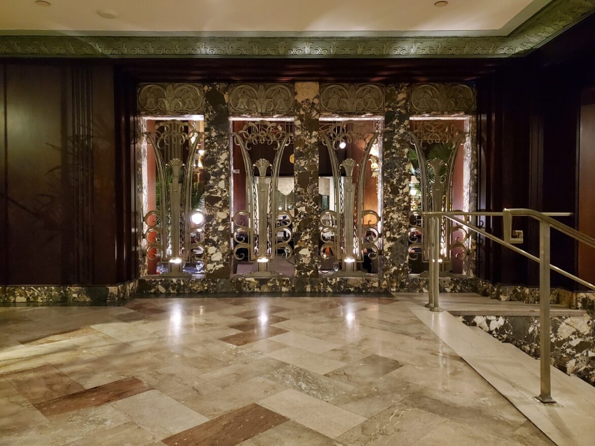 To the left of the grand staircase, and through beautiful milled rosewood, is the hotel’s elevator bay. No surface was considered too unimportant. Note the etched design on the elevator doors.