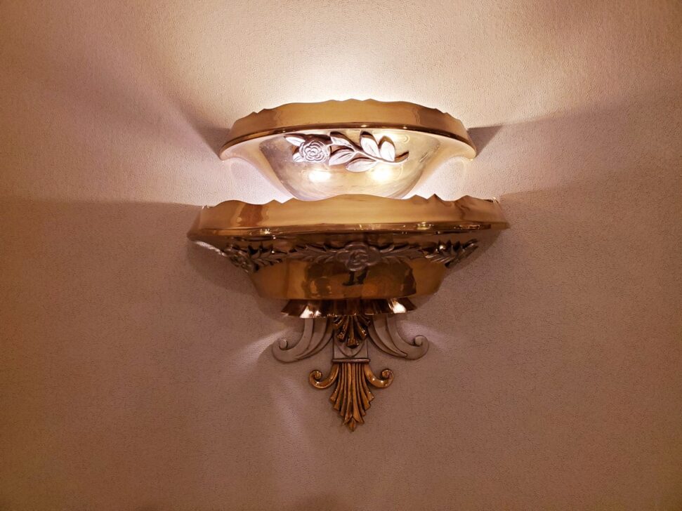 The room has eight beautiful sconces in the style of Edgar Brandt. An octagon wood frame surrounds faceted glass. The floral overlay is cast aluminum with a drape spilling out of the frame and onto the wall. Thankfully, these escaped being covered up or worse, being removed during earlier “modernization”.