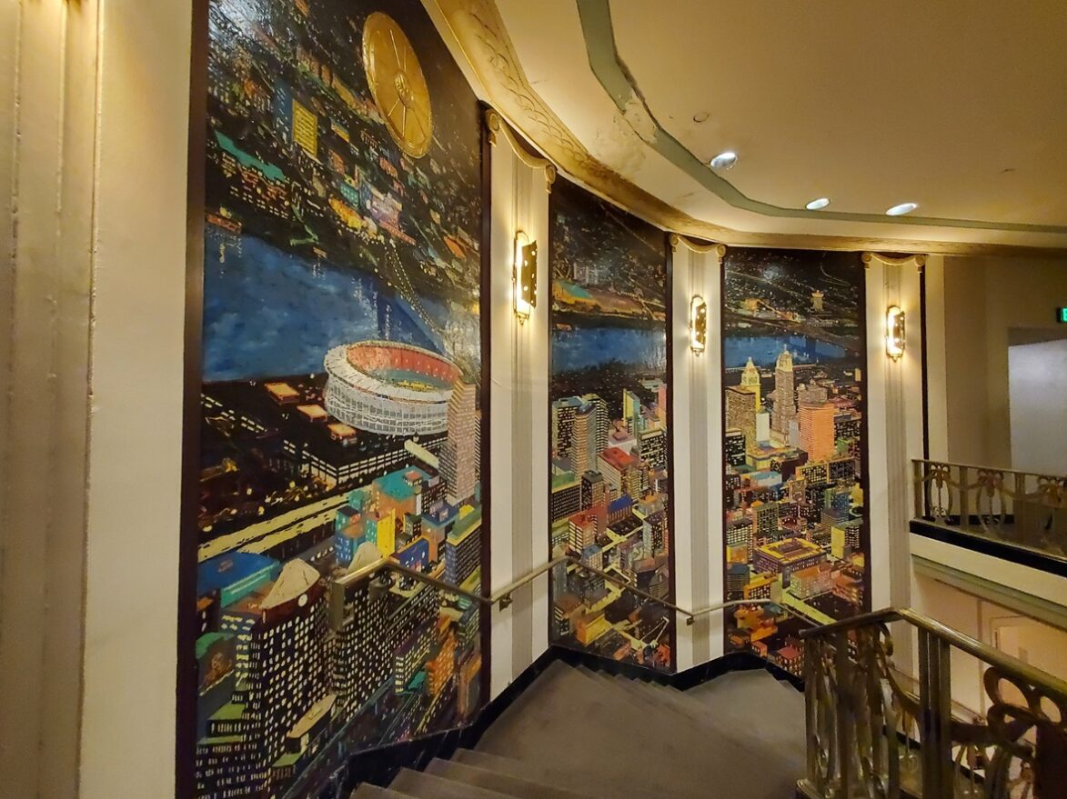 Back in the main reception room, either of the two semi-circular staircases lead to the two story Hall of Mirrors, originally the hotel’s main ballroom. The walls of the staircases are decorated with colorful and contemporary (1984) murals by artist Tom Bacher. They feature stylized views of Cincinnati and the paint is luminescent that glows when the lights are dimmed