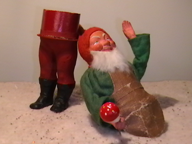 Harder to find than vintage Santa figures is this German-made candy container. Made of composition, his clothing are felt and leather. The mushroom he holds is a symbol, of good luck.