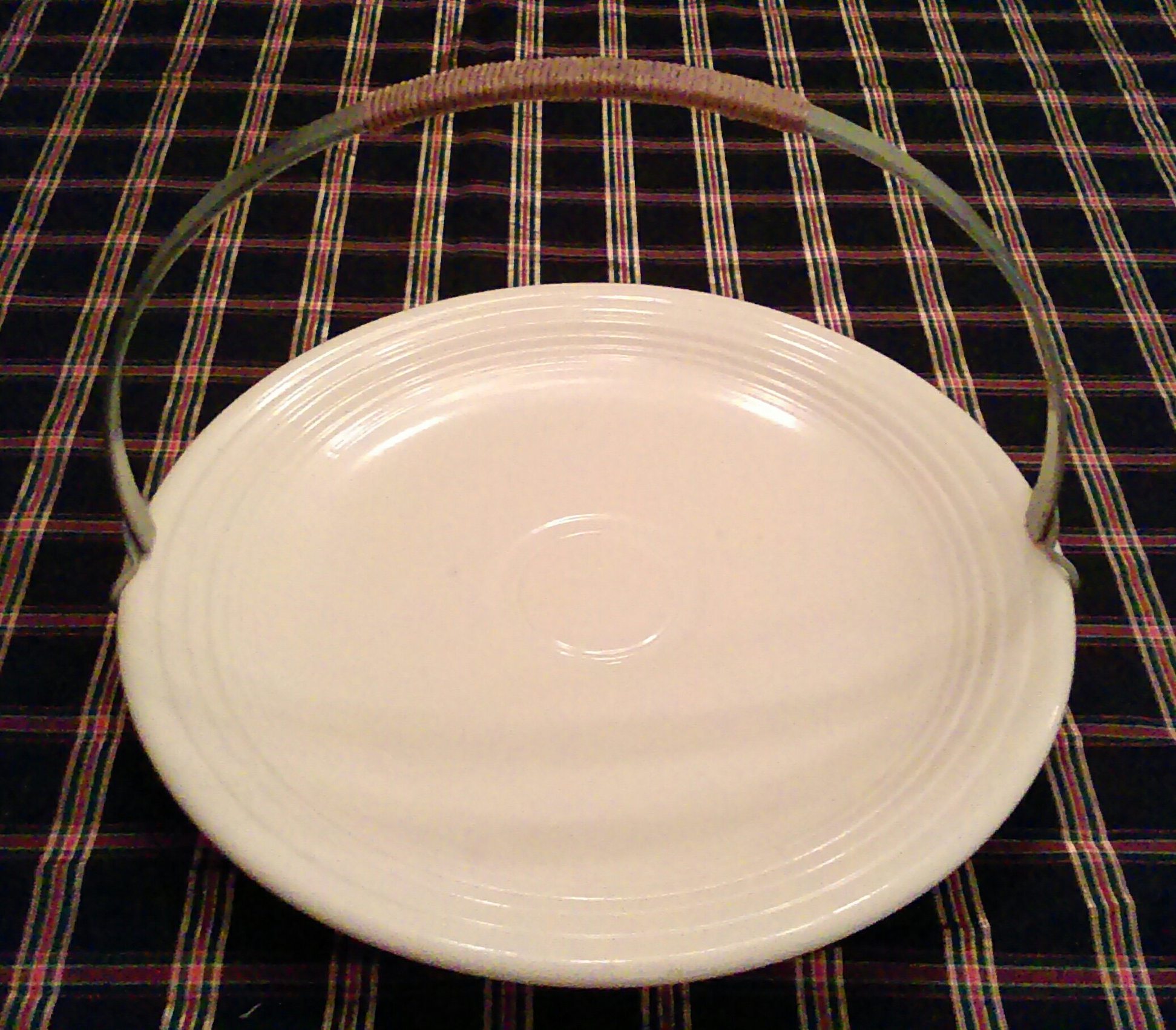 - 13 inch chop plate in old ivory with metal and raffia handle. Second to last promotional item, 1940. From the collection of the author.
