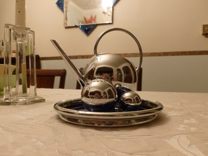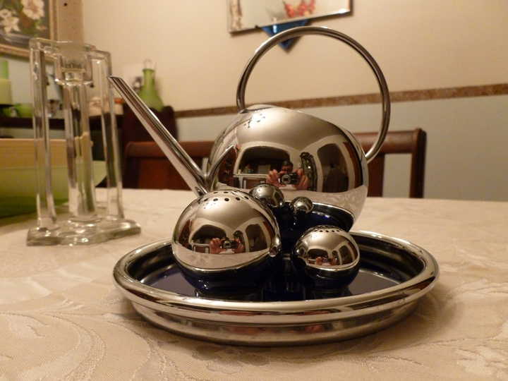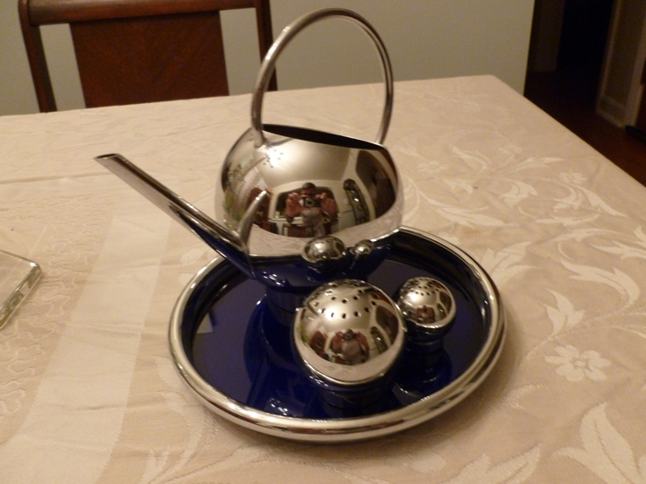 In a junk barn a half hour south west of Allentown, Pennsylvania, I came across this Chase Corn and Pancake set, designed by Russel Wright (1904 – 1976). Wright was an industrial designer who worked in New York City and is probably best known for his spun aluminum products made in the 1930’s and his famous lines of dinnerware such as American Modern (1939 – 1959) for Steubenville Pottery and Casual (1947 – 1967) for Iroquois. The Chase Corn and Pancake set was sold by the Chase Speciality Line between 1935 – 1940 and originally sold for $4.50 ($78.00 in 2014 dollars). It consists of a syrup jug, salt and pepper shakers and a chrome and blue glass tray. This set has a book value of $250 -$400. I was lucky to find this set in unused condition for $6.00.
