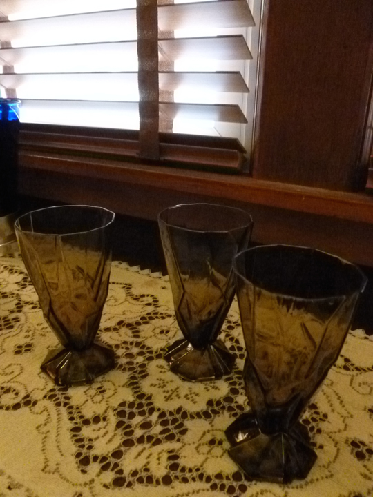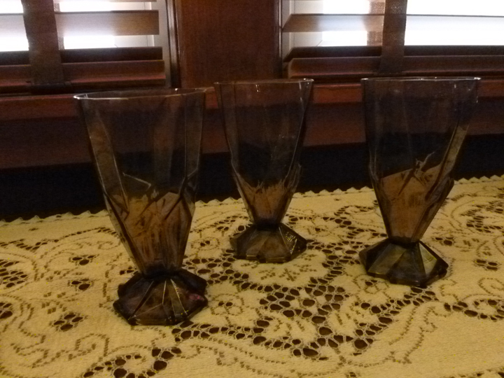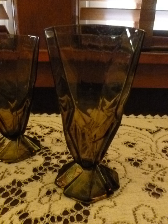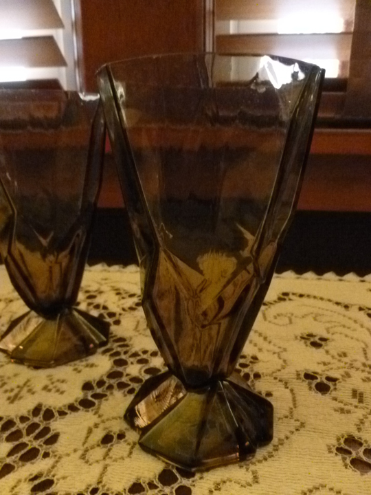 Another great find at the Vietnam Veterans Thrift Store, was a set of six Ruba Rombic 10 oz. footed tumblers for a $1.99 each. Ruba Rombic was created by Reuben Haley (1872 – 1933), the most important American glass designer of the 20th Century, for the Consolidated Glass Company of Coraopolis, Pennsylvania. Introduced in 1928 it was produced only until 1932 when Consolidated Glass closed, due to the depression. When the company reopened in 1936 Ruba Rombic was no longer part of the line. Upon its introduction, the company called it “An Epic in Modern Art”, most of the public called it “that crazy glass”. The colors of Ruba Rombic were Smokey Topaz, which is the color of the tumblers that I have, Jungle Green, Jade Green, Sunshine Yellow, Lilac, Silver, French Crystal and Opal. Jungle Green and Smokey Topaz are the most common of the colors. Aside from the extreme look of the items, it was also very, very expensive – the 10 oz. tumblers that I picked up cost $9.00 a piece in 1928, which is the equivalent of $125.00 in 2014 dollars. Today Ruba Rombic is very rare, Jack Wilson an expert on Consolidated Glass feels that less than 3,000 pieces of Ruba Rombic exist. These tumblers are worth about $275 – $300 each.