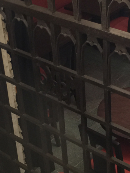 The restrooms of the Tick Tock Cafe are downstairs next to what was the vault of the Manufacturers Trust Company, which had a branch at street level. The Deco iron gates with the bank’s initials are still in place.