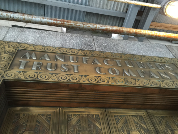 Though the bank is gone its street entrance remains. Even with the scaffolding in front of it, the doorway still shines through.