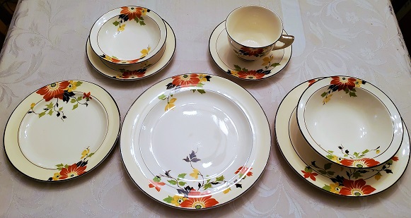 Homer Laughlin, Clematis: On one of our trips to (the sadly closed) All That Jazz Antique Mall, Anthony spotted a box of china. Lots of china! I was initially ambivalent. I liked it, but we have so much dishware already. The pattern and the price were nice and didn’t take much convincing and it is very deco.  I walked away with a box of Homer Laughlin Wells china with the Clematis (also called Red Beauty) decal for $42.00. After some research, we found it to be one of the more desirable decals and difficult to find, let alone 92 pieces!