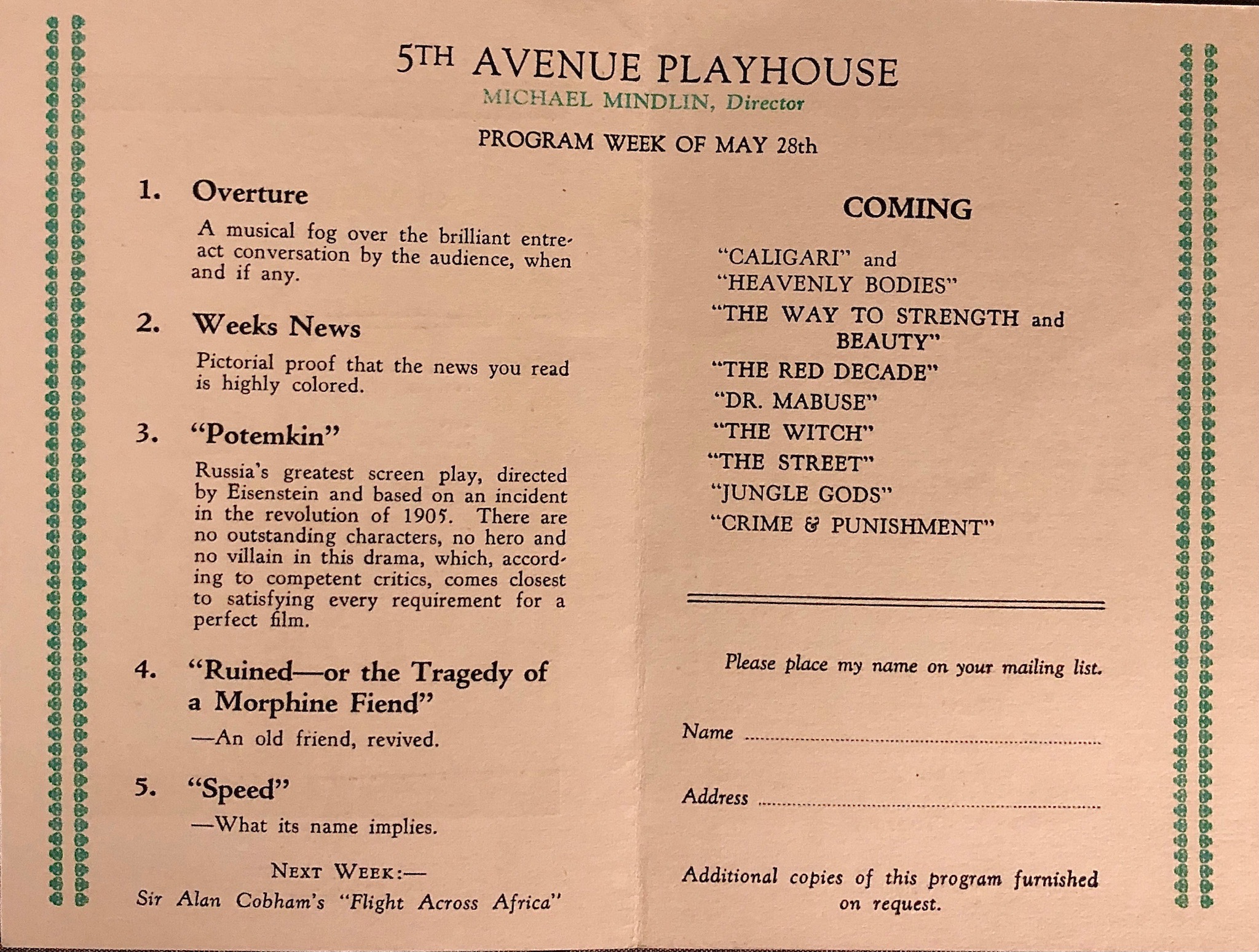 - Typical programing for the 5th Avenue Playhouse, circa 1926.