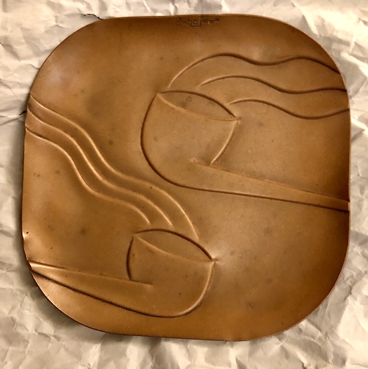 A few weeks ago when Chris picked up a couple small copper plates from the Golden Nugget Flea Market, I did not realize the road it would take me down. The signature stamped on them reads “Rebajes”. I was unfamiliar with this name. One plate features two hands playing a guitar and the other is two pipes. Both are highly stylized depictions, very similar to the paintings of Stuart Davis. Stamped in each plate is a name / signature of “Rebajes”.