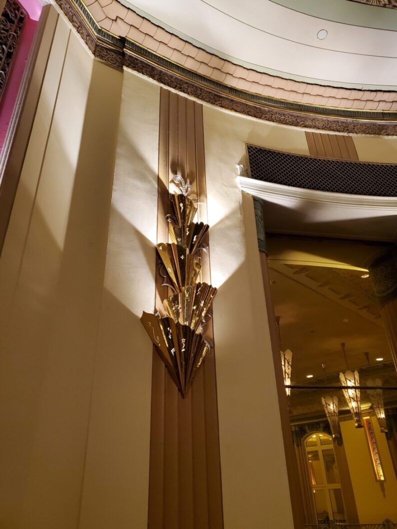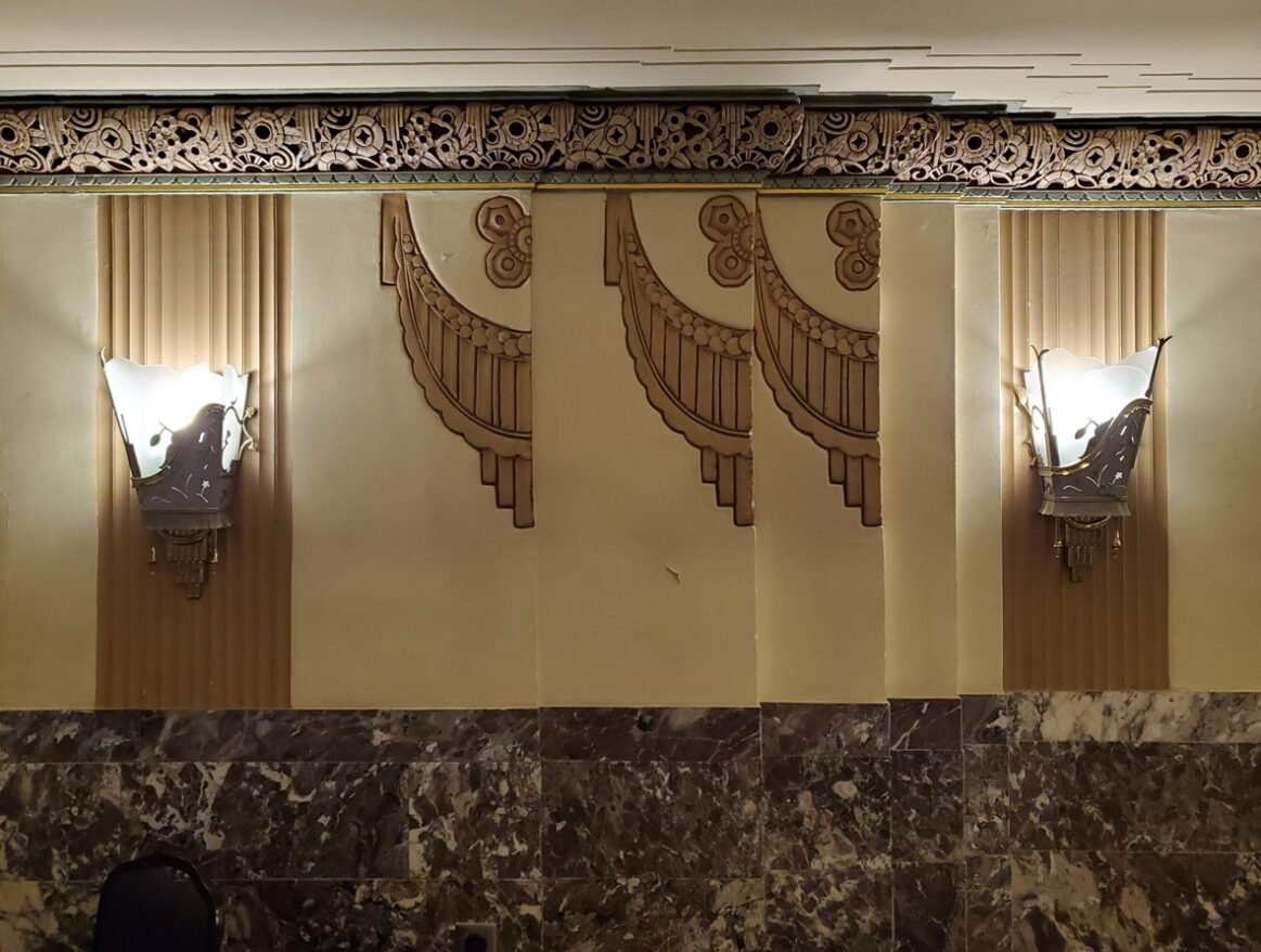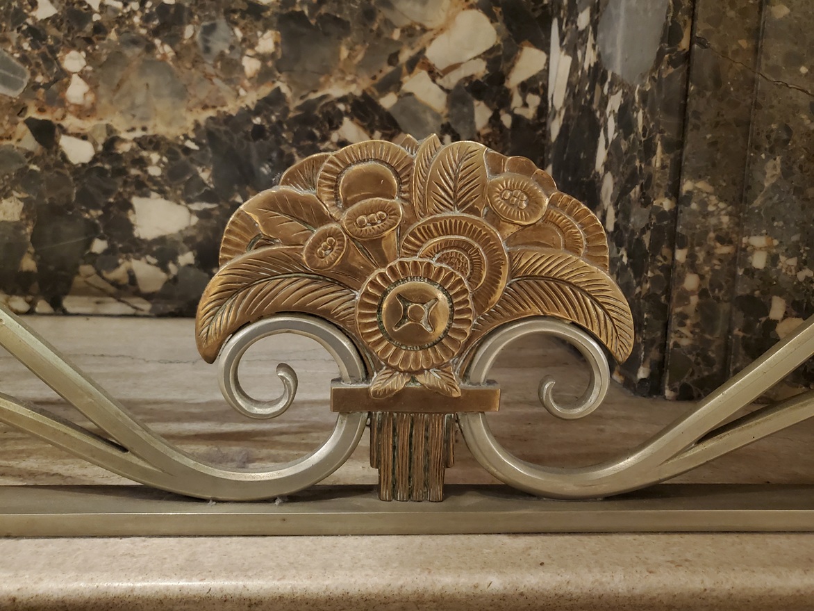 The room has eight beautiful sconces in the style of Edgar Brandt. An octagon wood frame surrounds faceted glass. The floral overlay is cast aluminum with a drape spilling out of the frame and onto the wall. Thankfully, these escaped being covered up or worse, being removed during earlier “modernization”.