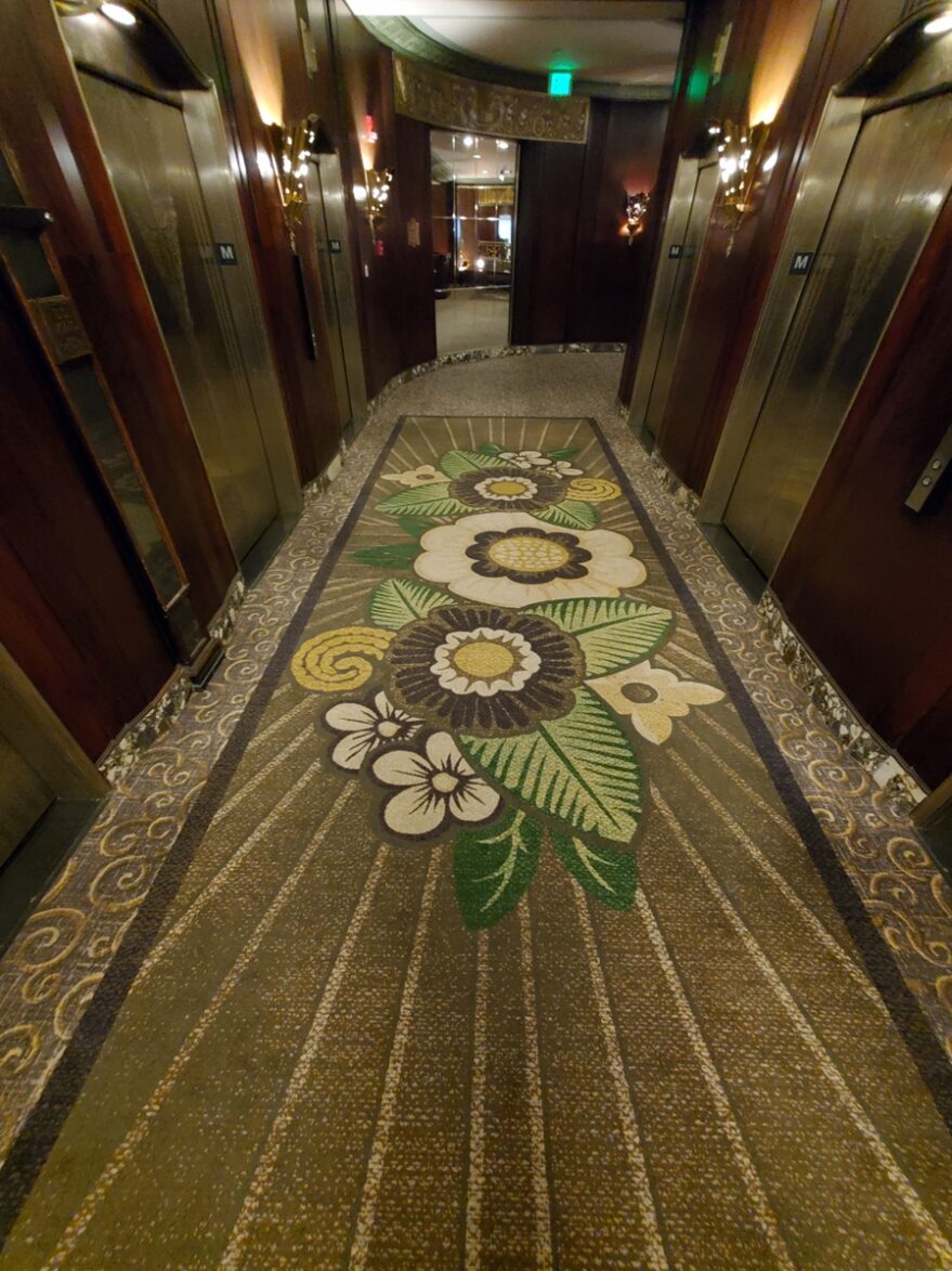 To the left of the grand staircase, and through beautiful milled rosewood, is the hotel’s elevator bay. No surface was considered too unimportant. Note the etched design on the elevator doors.