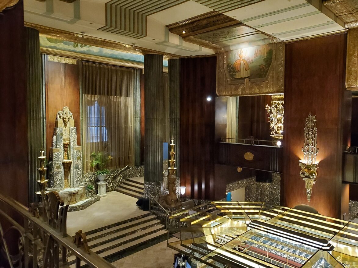 A glance back from the landing. The stepped, curved architecture frames the lower mezzanine’s floral carpet. This provides both a transition and a unification of different deco styles.