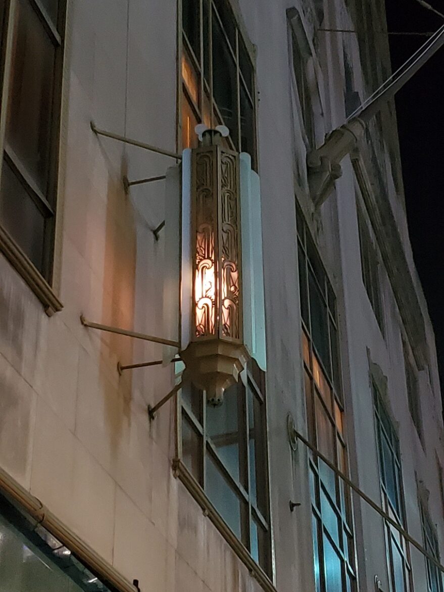 One of the exterior lights on the Netherland Plaza Hotel.