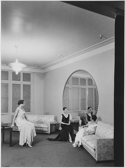 “. . . the fourth floor – which, together with the sixth, seventh and eighth floors, was planned by Eugene Schoen – one sees the color scheme soften from black and cream to gray. At the far end definite colors lure the eye. Opening off the centre space are intriguing places for the showing of sports apparel; a ‘Winter’ and a ‘Summer’ room, each with walls appropriately decorated. Appropriateness has been studied with such care that once finds dressing rooms lined with blue for blonde and with tan for the brunette.