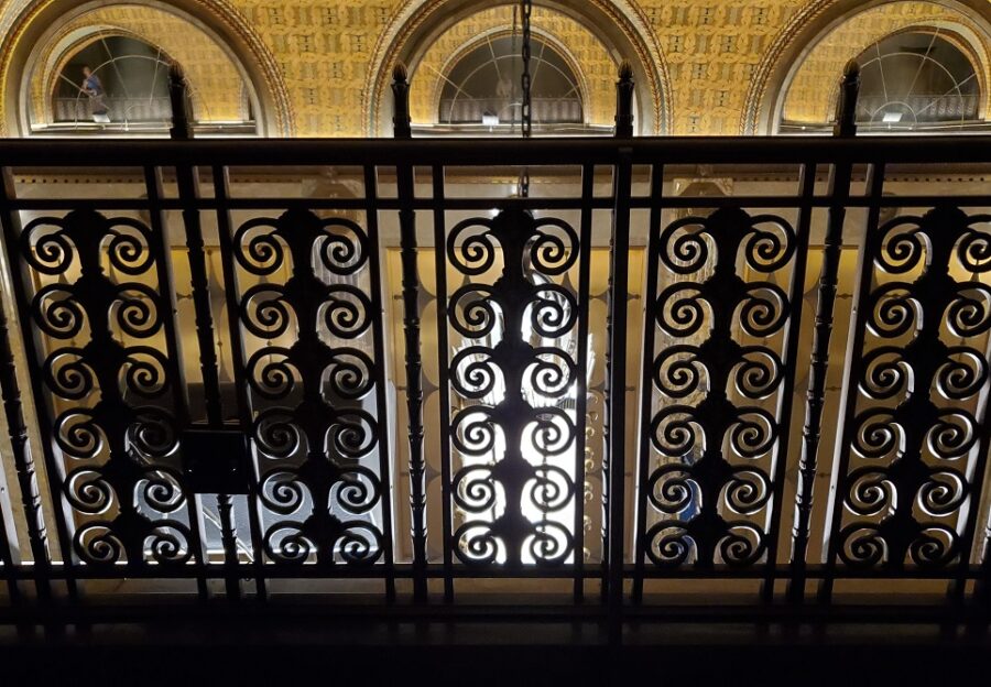 Still, with no expense spared, first class artisans contributed their talents from engineering to the fine detail work throughout. And he most notable feature is the three story arcade featuring Géza Maróti, hand-painted barrel-vaulted ceiling. Recognized as “Detroit’s Largest Art Object”, it is undergoing continued restoration since 2015 at the cost of 30 million dollars.
