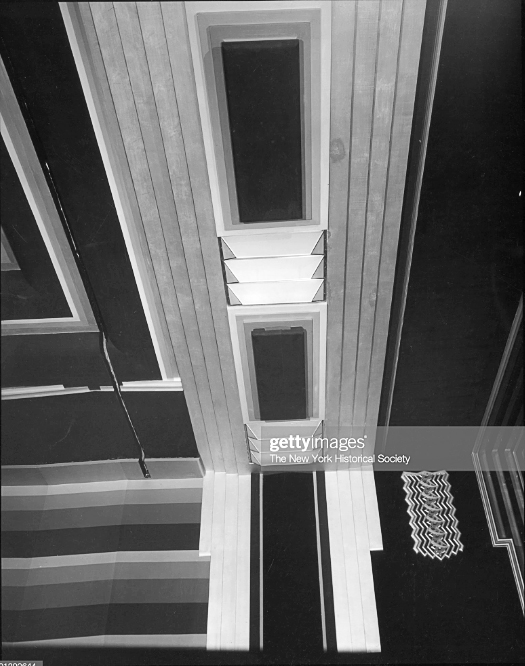 - Detail of the rear balcony, with skyscraper, aluminum wall decoration and banded, painted walls. Image from Getty Images / New York Historical Society.