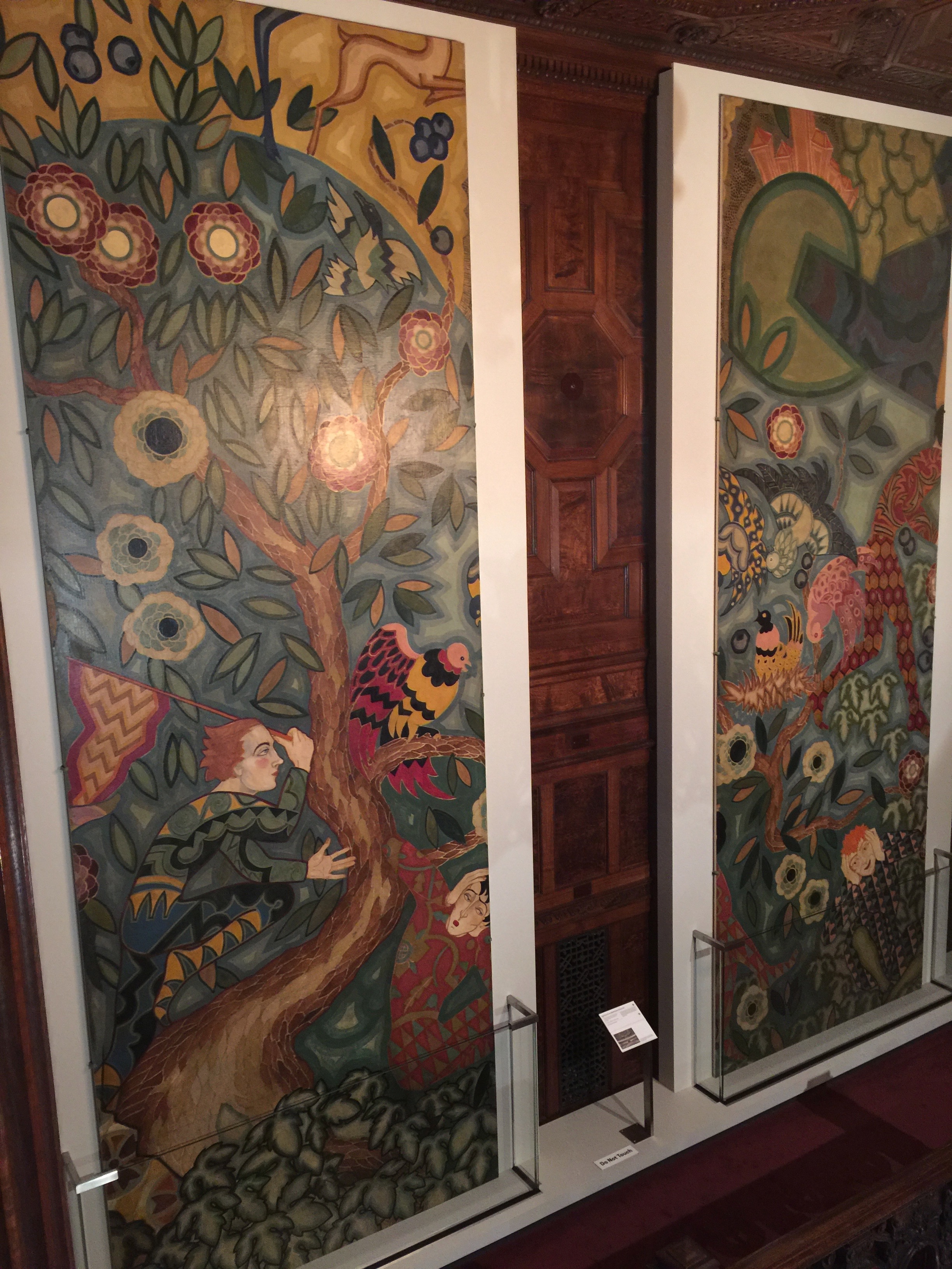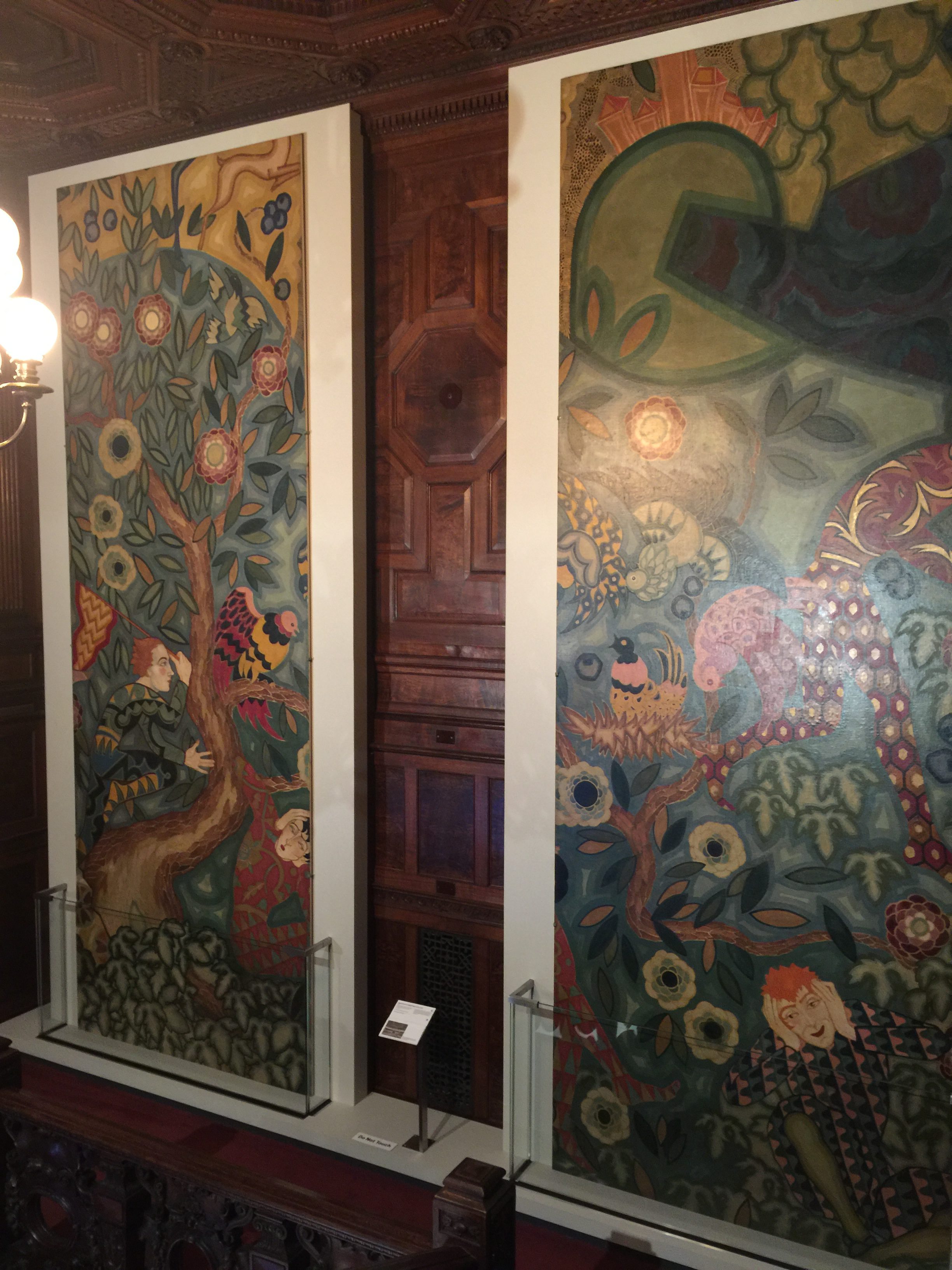 The panels are oil on canvas and are on loan from the collection of Richard H. Driehaus. Period photographs do not justice to the mural, it comes to life when seen in color. When entering the exhibit proper there is a remarkable mirror, lamp and console table.