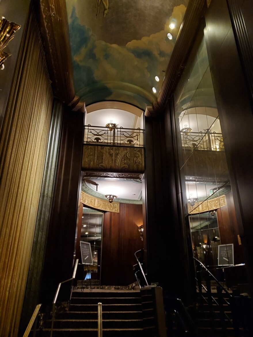 But it is from the mezzanine, you can truly appreciate the details of the chandelier suspended over the grand staircase, and the murals surrounding it.