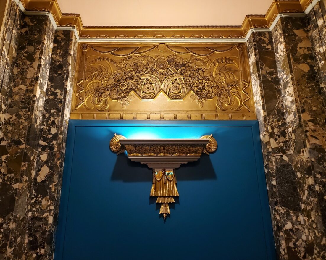 Tan marble, separated by aluminum strips cover the lobby walls while other inlaid aluminum strips create modernistic wall decorations. The white doors feature black ziggurat stripes, a very popular decorative effect in the 1920s and 1930s.