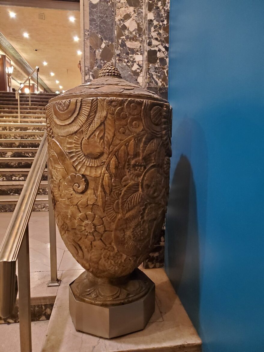 Perhaps Bourdelle’s most spectacular mural is in the former Women’s Dining Room Lounge across from the Lunch Room. It is a fanciful jungle scene made from carved linoleum.