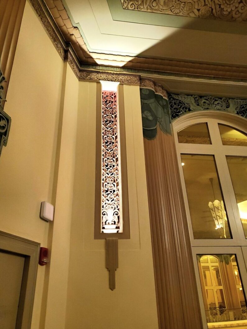The room has eight beautiful sconces in the style of Edgar Brandt.  An octagon wood frame surrounds faceted glass. The floral overlay is cast aluminum with a drape spilling out of the frame and onto the wall.  Thankfully, these escaped being covered up or worse, being  removed during earlier “modernization”.