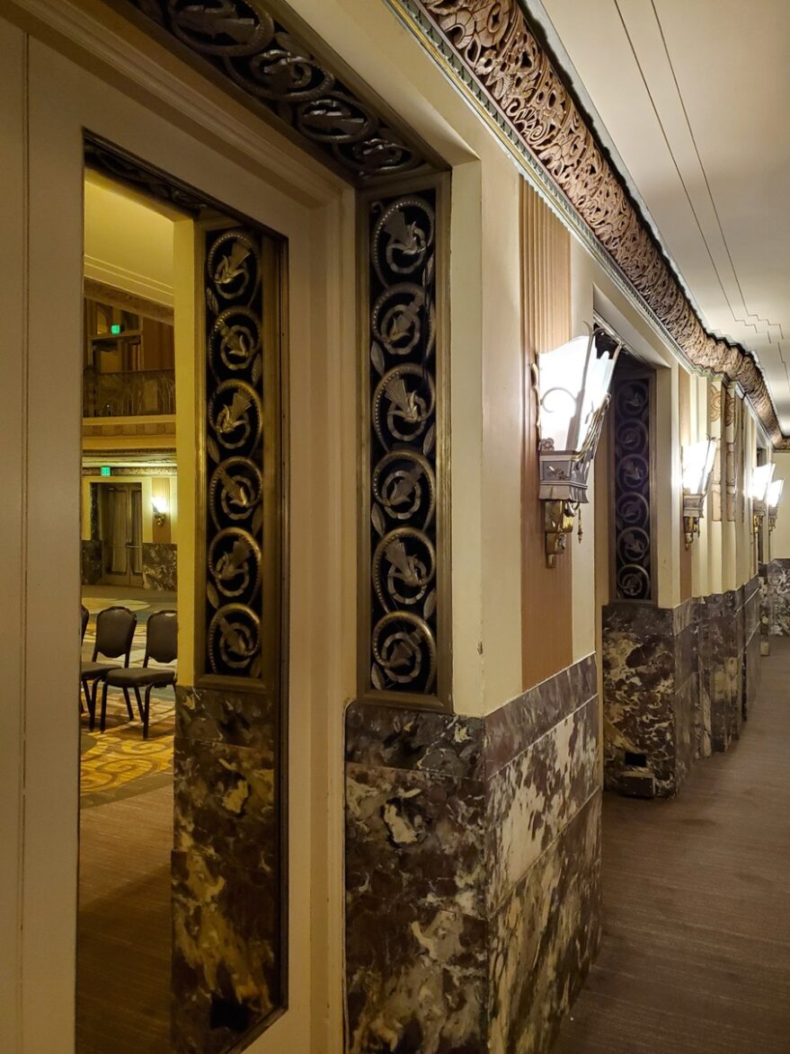 To the left of the grand staircase, and through beautiful milled rosewood, is the hotel’s elevator bay. No surface was considered too unimportant. Note the etched design on the elevator doors.