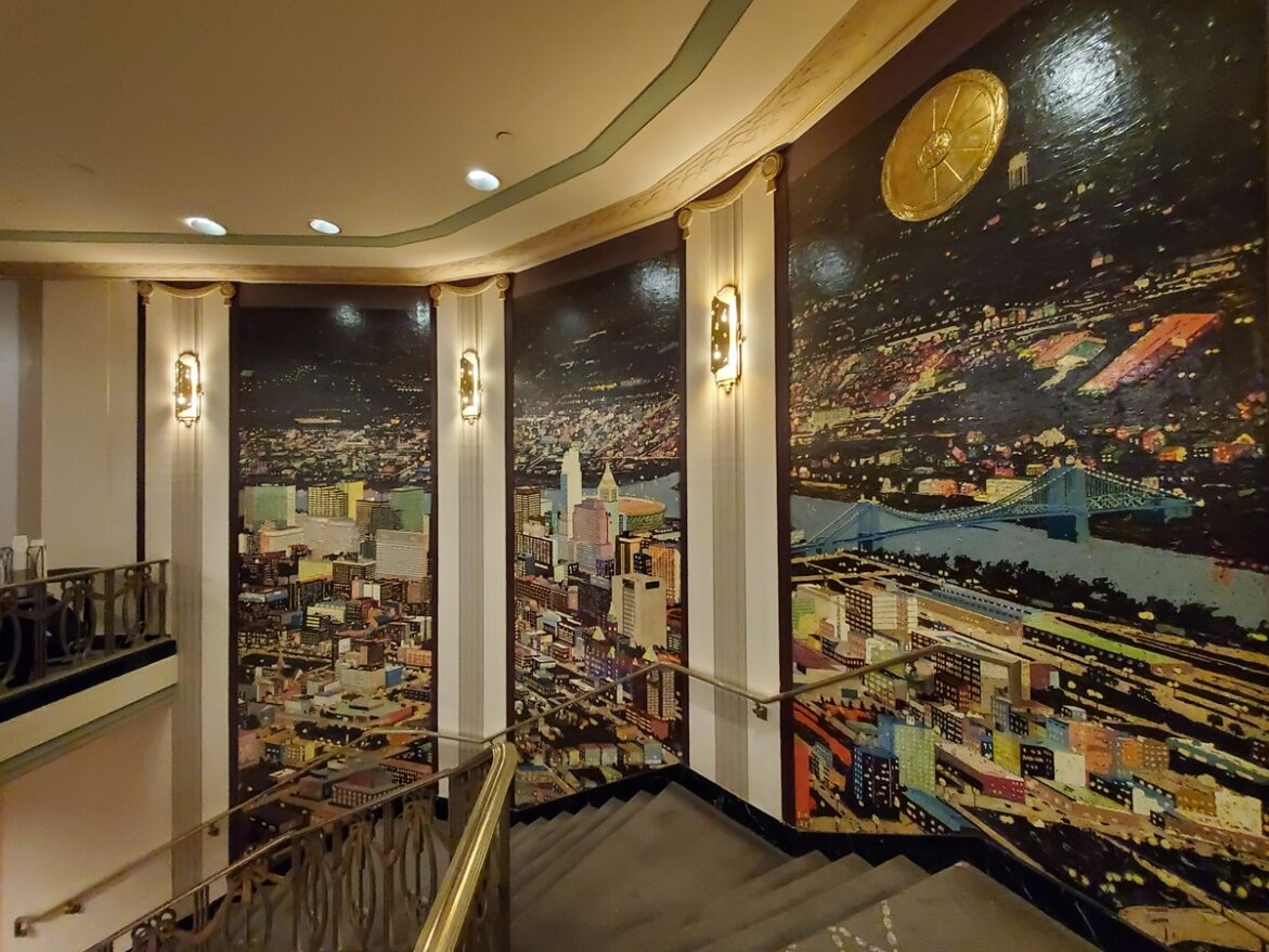 Back in the main reception room, either of the two semi-circular staircases lead to the two story Hall of Mirrors, originally the hotel’s main ballroom. The walls of the staircases are decorated with colorful and contemporary (1984) murals by artist Tom Bacher. They feature stylized views of Cincinnati and the paint is luminescent that glows when the lights are dimmed