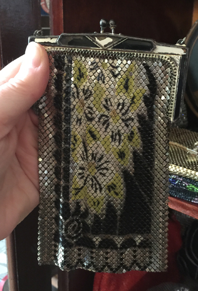 The most well-known name in vintage mesh handbags is Whiting & Davis. They are usually very well marked, either with the name stamped on the inside of the frame or with a small metal tag located on the inside of the frame. The deco of the bag can be in its frame, in the design of the enamel mesh, or both. These three Whiting & Davis bags are great examples of the types you might find: