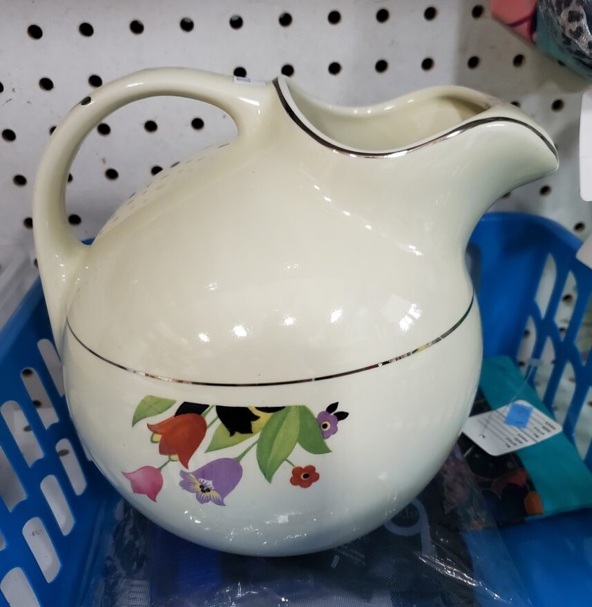 This 1930s Hall ball jug in the Crocus pattern is in mint condition. It is also the only time I got into an argument with another customer. The short version; I put it down in front of me to look at another pitcher. A woman walks up, asks me if I was buying it to which I responded, “Yes”. She proceeds to pick it up and walk away!??? I again told her I was buying it and she responded, “Well, you didn’t have your hand on it. It’s mine now.” Details are so messy. Let’s just say – I won!