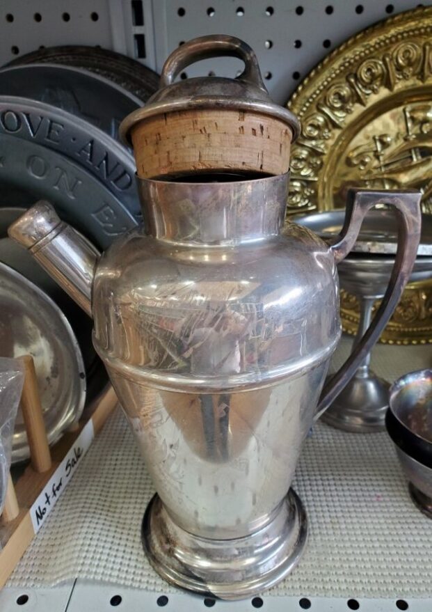 We’ve had good luck at the Good Stuff Thrift Store. No brand silver-plate cocktail shaker purchased for $4.50. This unusual item dates to the 1930s. The cork stopper both in the lid and also in the pour spout cap are more common features at that time. It’s amazing what a little elbow grease (and a good polish compound) can do.