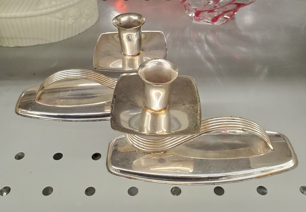 This pair of silver-plate candle holders is designed by Carl Deffner, They could be anywhere from the 1930 to the 1960s. And they have a no-polish finish. The pair cost $2.50.