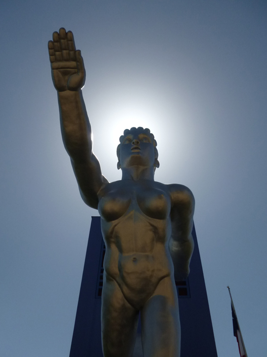 One of the earliest of Fair Park’s Beaux Arts buildings was the Coliseum, which was remodeled in 1935 into the streamline moderne Administration Building. On the front facade is mural depicting Texas flora and fauna, designed by Carlo Ciampaglia. Directly in front of the mural is the statue, Spirit of the Centennial, designed by Raoul Josset and sculpted by Jose Martin. The mural and statue were restored in 1998 by Stashka Star. The Administration Building became the Women’s Museum in 2000 and is now closed.