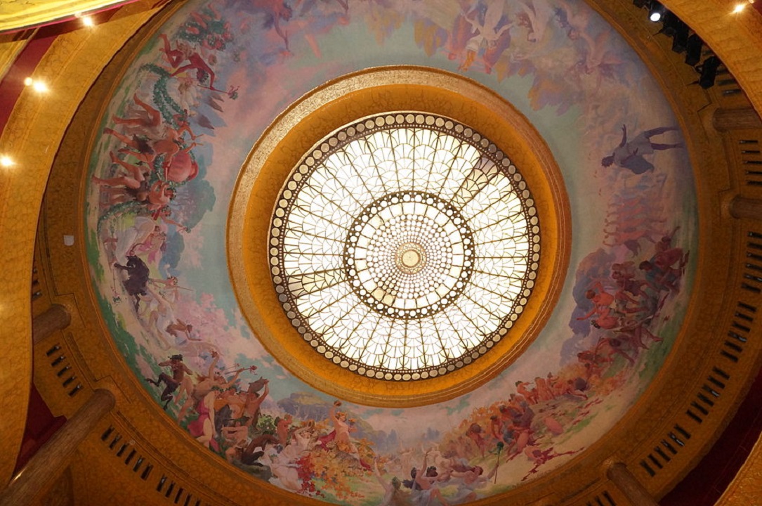 The interior of the Ziegfeld Theatre, showing a portion of Joseph Urban’s mural The Joy of Life. Image from Pinterest.
