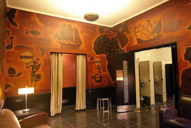 Deskey was a master of using out of the ordinary materials to make a statement. Nowhere is this more true than in the second mezzanine men’s lounge. The walls are covered by aluminum foil (donated by the Reynolds Tobacco Company) wallpaper with brown figures depicting the growing and selling of tobacco. Entitled Nicotine, it is the perfect wall covering for the space.