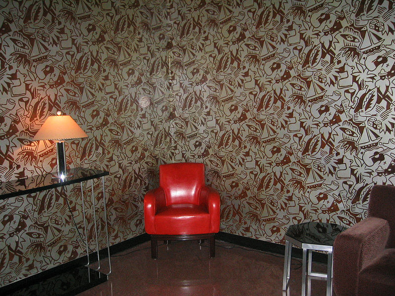 - “Nicotine” aluminum foil wallpaper designed by Donald Deskey. Depicting the tobacco industry.