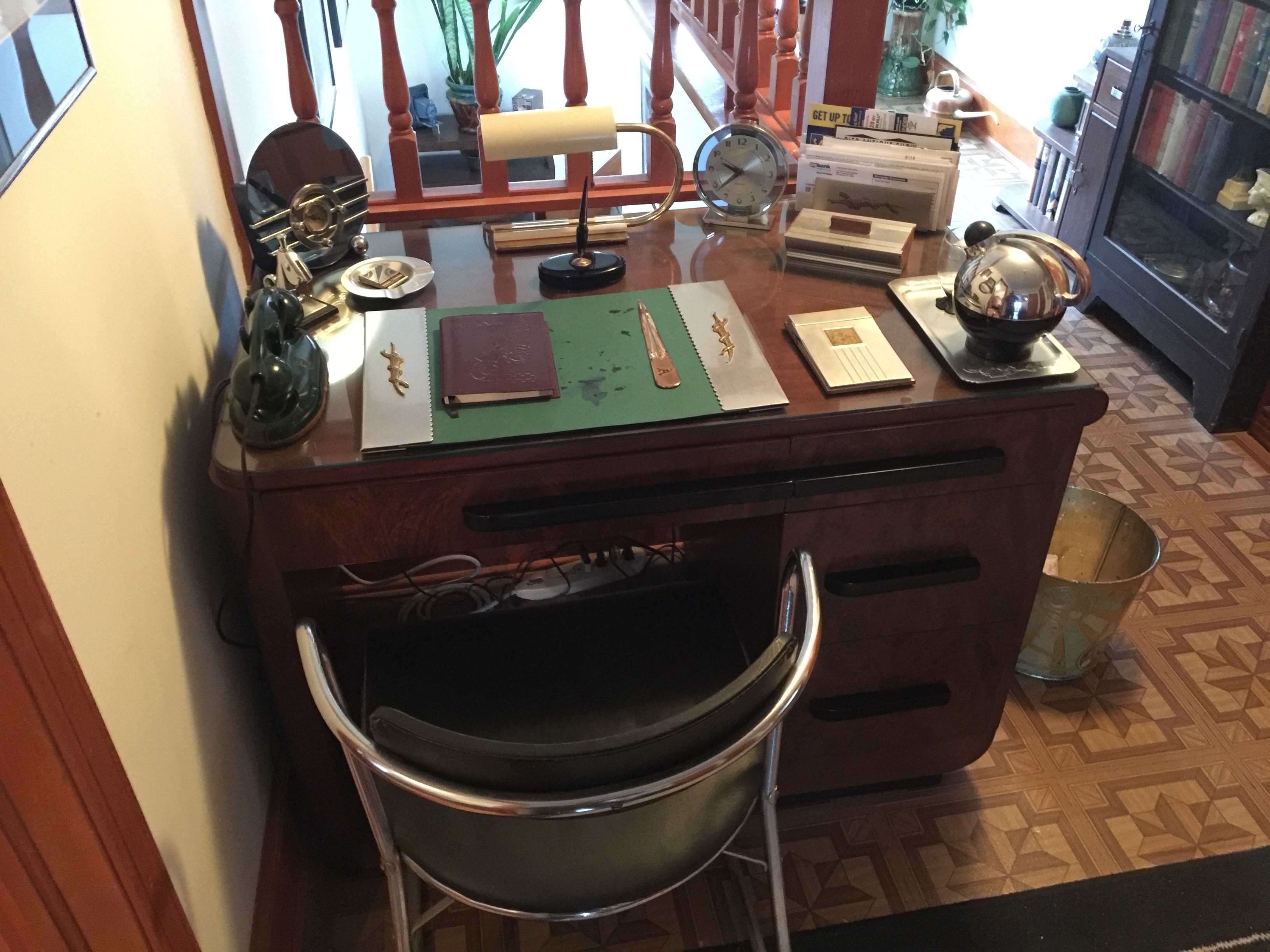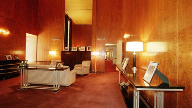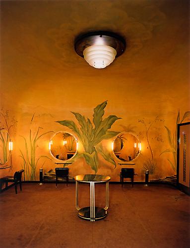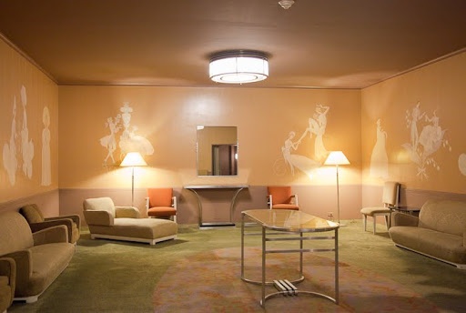 - The second mezzanine men’s lounge with Deskey designed furniture and wallpaper.