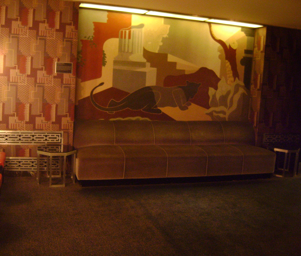 Donald Deskey designed several textiles located around the theatre. His vision in the Grand Lounge carries a “diamond” theme from the ceiling lights through the mirrored columns right down to the carpet.