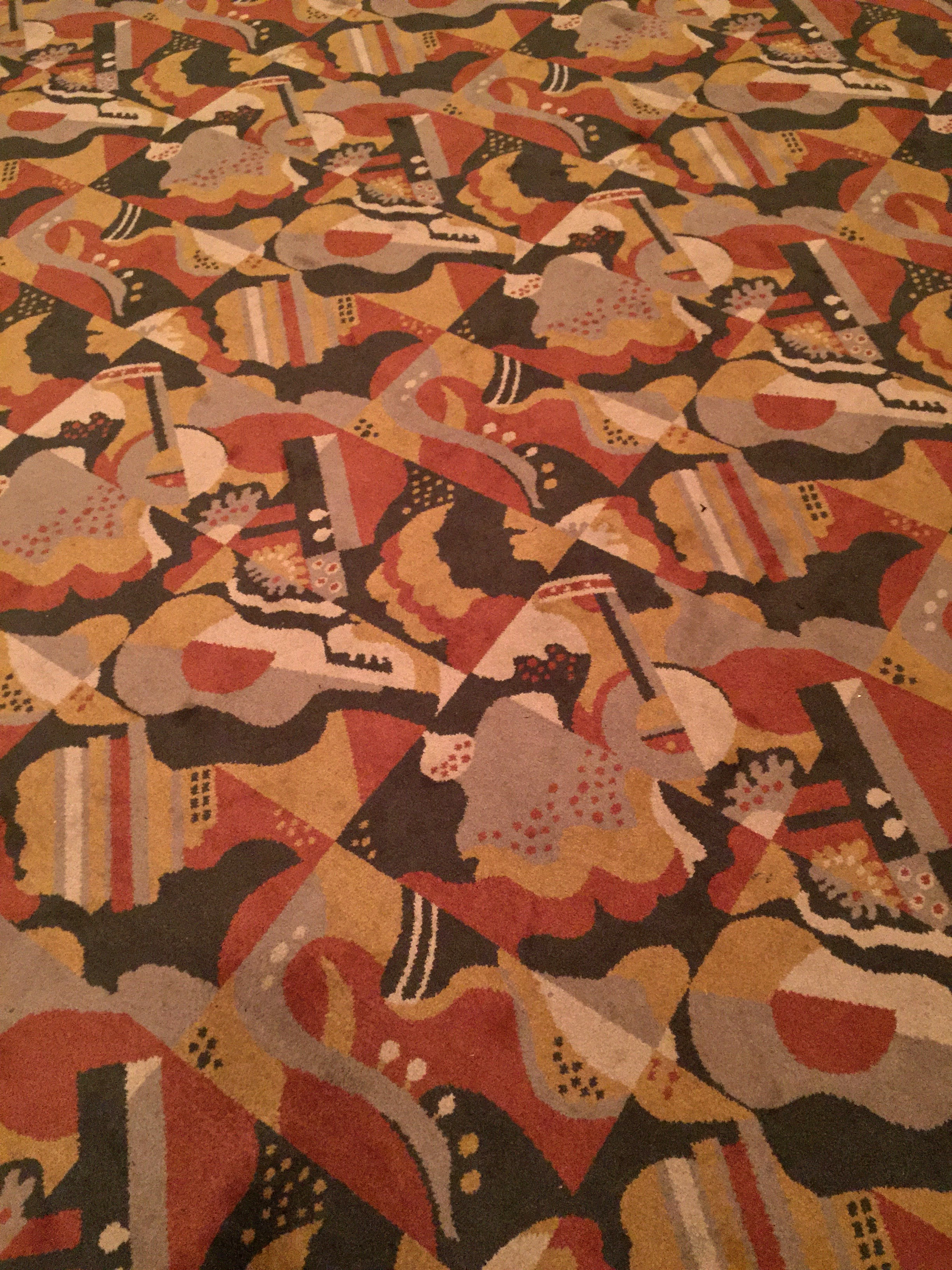 Ruth Reeves‘ textile design was influenced by cubism and that is clearly seen in her two works at the Music Hall. Still Life with Musical Instruments is probably Reeves most recognizable textile work. Comprised of very abstract and not so abstract representations of a guitar, banjo, clarinet, saxophone, accordion and harp in shades of gray, gold, rust, cream and black adorn the carpets in the Grand Foyer and its adjoining staircases.